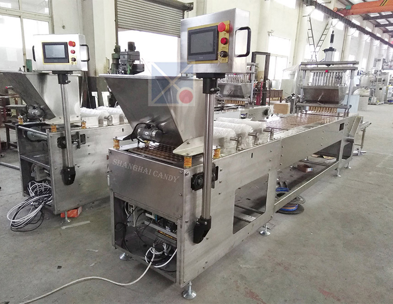 This machine is used to inject liquid chocolate into hollow biscuit. It mainly consists of machine frame, biscuit sourting hopper and bushes, injecting machine, moulds, conveyor, electrical box etc. The whole machine is made by stainless stainless 304 material, whole process is automatic controlled by Servo driver and PLC system.