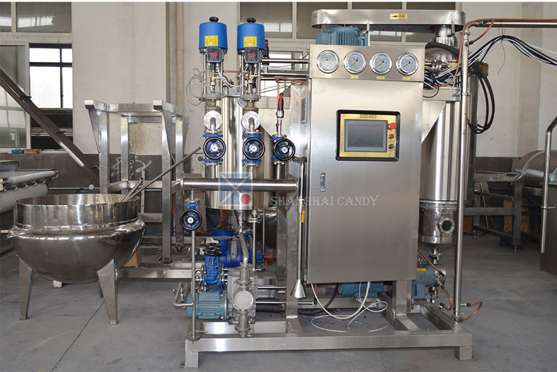 This unit consists of PLC control system, feeding pump, pre-heater, vacuum evaporator, vacuum pump, discharge pump, temperature pressure meter, and electricity box. All these parts are installed in one machine, and connected by pipes and valves. Flow chat process and parameters can be clearly displayed and set on touch screen. The unit has many advantages as high capacity, good sugar-cooking quality, high transparent of syrup mass, easy operation. It is an ideal device for the hard candy cooking.