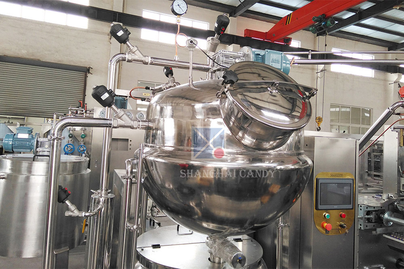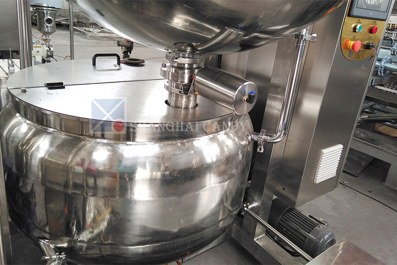 此熬糖機專門用于高質量明膠軟糖的熬煮和調配,夾層鍋體采用水保溫或者蒸汽加熱,帶攪拌器和電機。糖漿從化糖鍋通過真空輸送到調配鍋,水分可以快速抽掉,使糖漿在短時間內降溫。達到設定溫度后,化開的明膠溶液輸送到調配鍋中,和糖漿一起攪拌均勻后,輸送到儲存鍋中,準備進入下一段工序。