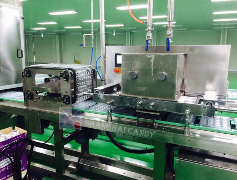 本機是我司最新研發的巧克力澆注成型的專用先進設備,集機,電,氣控制于一體,整個生產流程包括烘模,澆注,振蕩,冷卻,脫模,輸送等全自動工作程序,可選配果仁投放機生產果仁混合型巧克力。本機具有產量高,靈活性大,脫模率高,生產巧克力品種多
